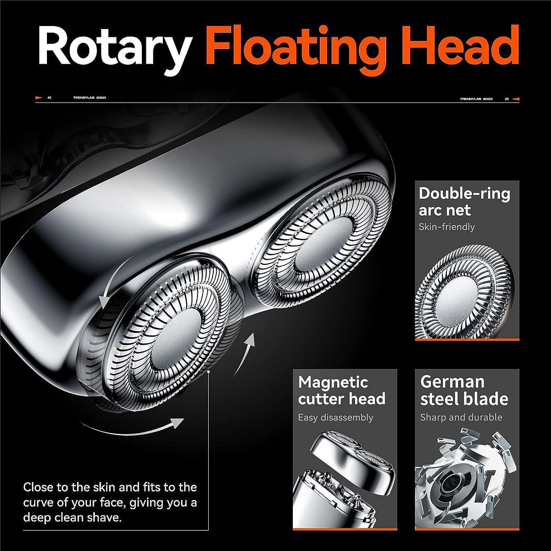 Skärpt rostfritt stål med virvelblad, anpassat för tufft skägg. 0,1 mm tunn folie i rostfritt stål, dubbla ringar med 3D-knivnät ökar rakvolymen, medan den flytande bågytan ger en smidig rakning och tar bort hår effektivt.